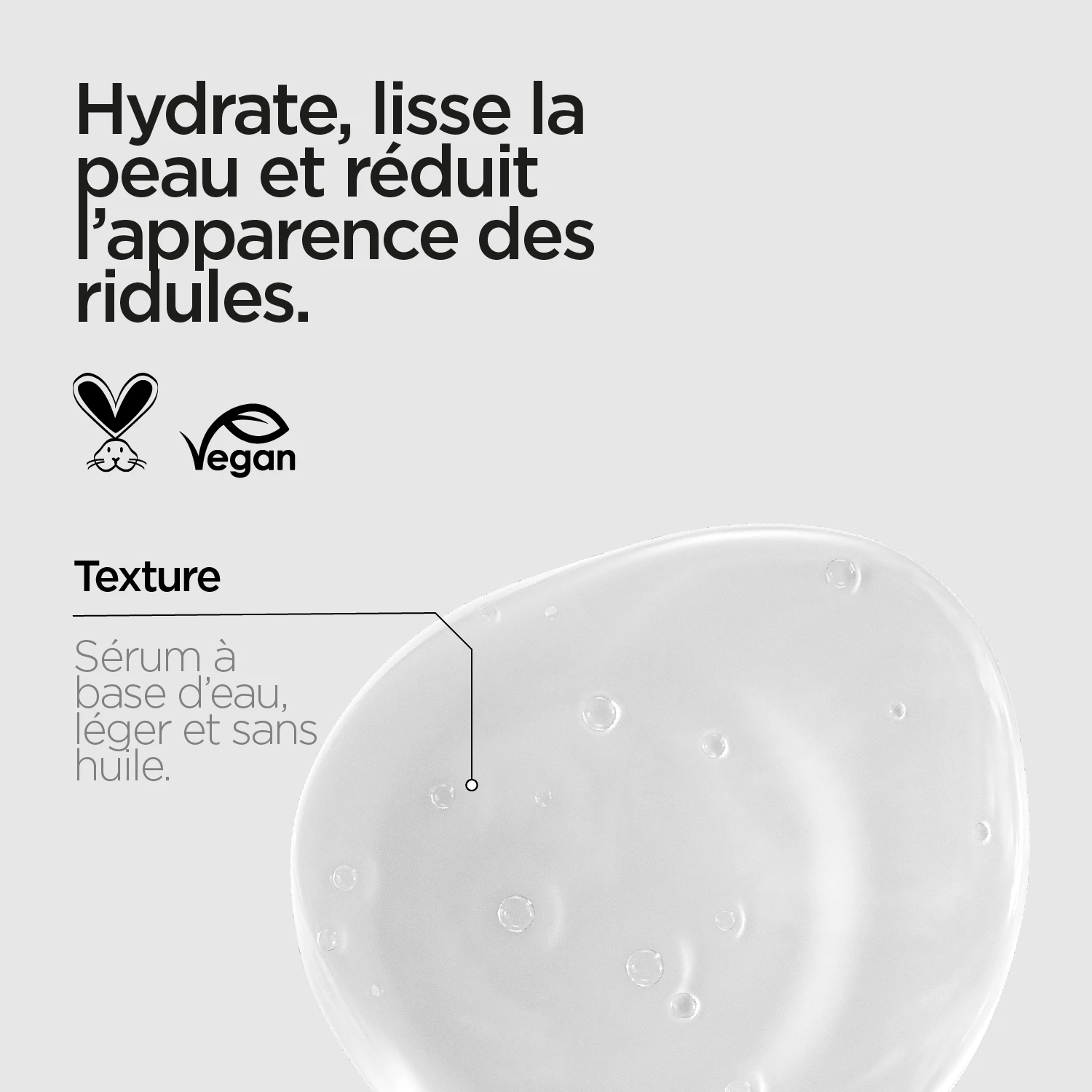 L’acide hyaluronique (HA) est une substance naturellement présente dans notre peau. Il agit en empêchant la perte d’humidité et en la retenant dans la peau, ce qui aide à la garder hydratée et repulpée tout au long de la journée. L’acide hyaluronique contribue à l’aspect plus frais et plus lisse de la peau. La formule du sérum est légère et rapidement absorbée.