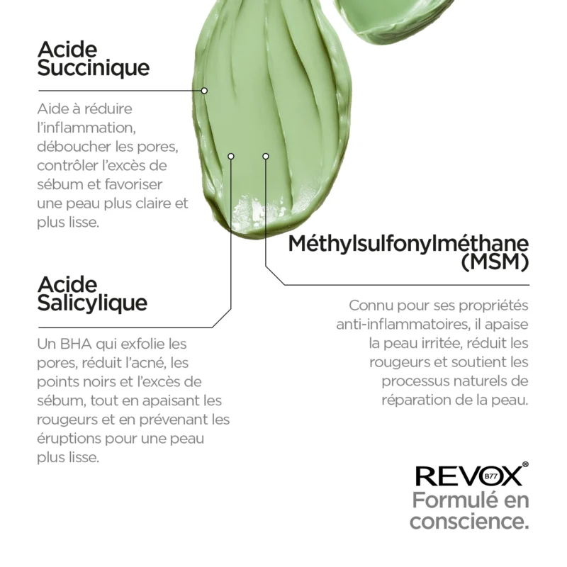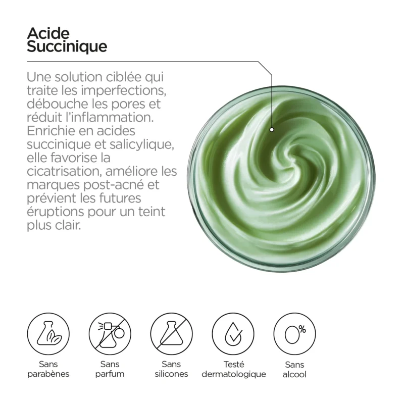 Quelle est la différence entre l’acide succinique et l’acide salicylique pour traiter les boutons ? Là où l’acide salicylique désobstrue les pores en profondeur et élimine l’excès de sébum, l’acide succinique à 2% agit en amont en réduisant l’inflammation et en empêchant les pores de se reboucher. Ce produit combine les deux actifs dans une texture crème applicable sous le maquillage, ce qui le rend plus polyvalent qu’un soin topique classique à l’acide salicylique seul.