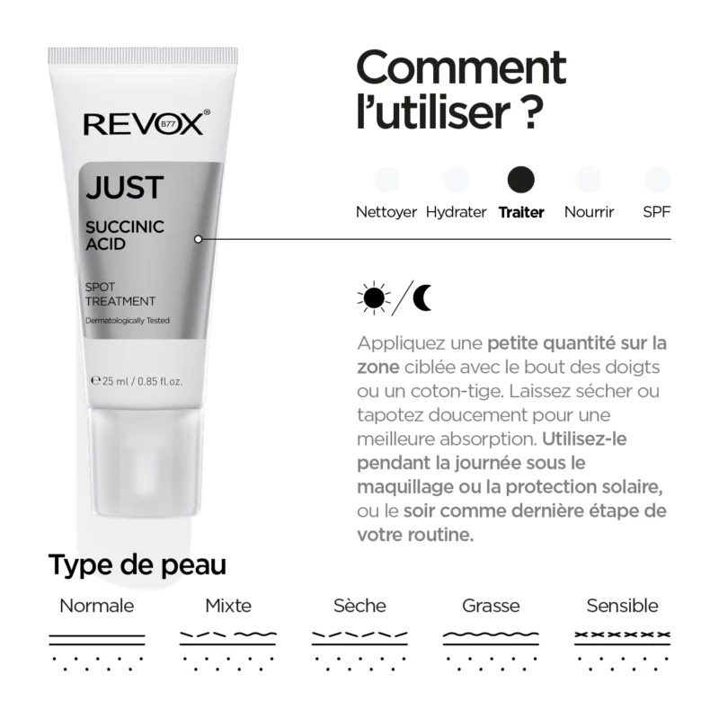 REVOX B77 JUST SUCCINIC ACID SPOT TREATMENT est une solution pour le traitement topique des imperfections et des taches brunes. Les boutons peuvent apparaître en raison d’une sécrétion excessive de sébum et de cellules mortes non éliminées qui obstruent les pores et les follicules pileux.
