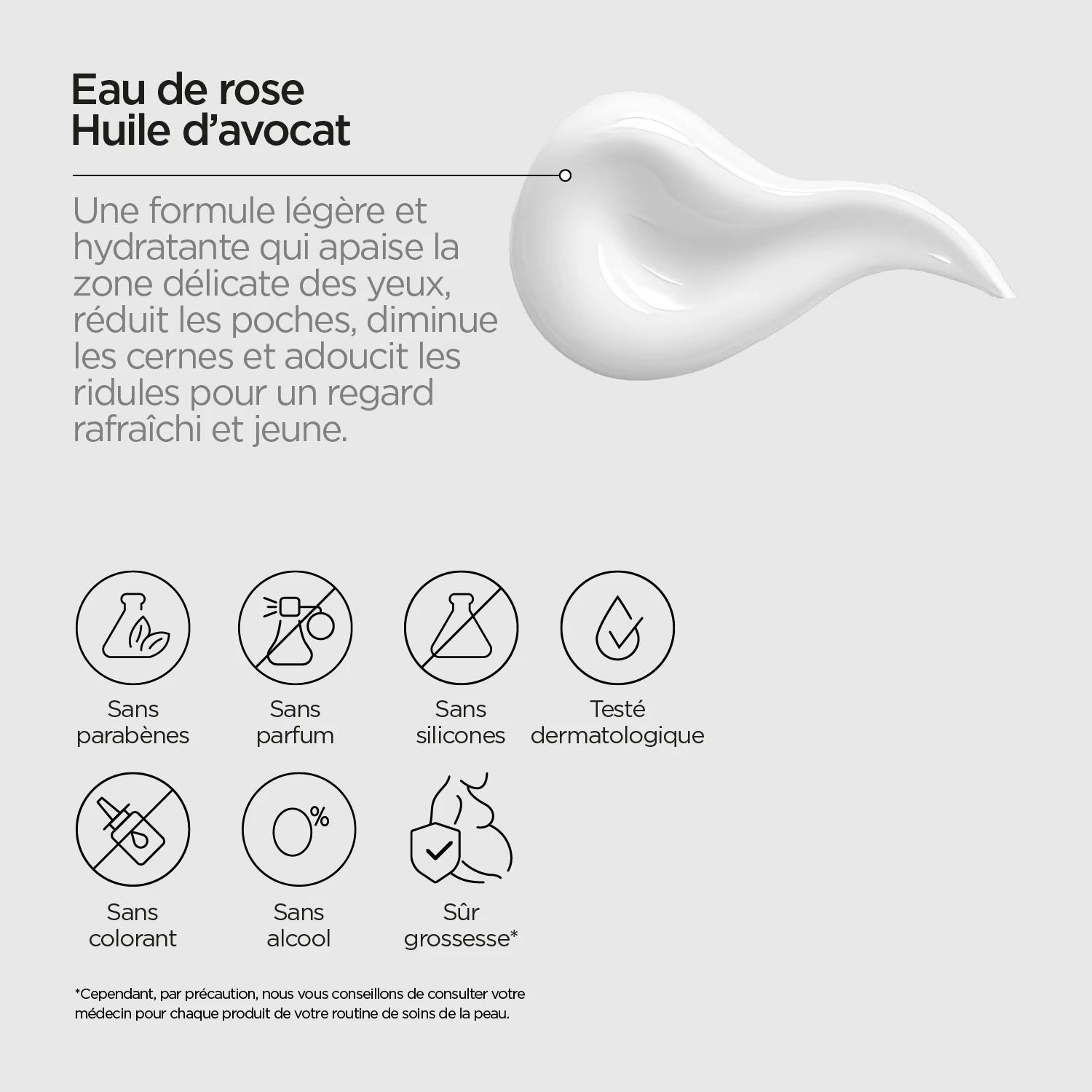 Ce fluide de soin des yeux profondément hydratant est enrichi en eau de rose, beurre de karité, huiles d’avocat et d’amande douce pour prévenir les cernes. Il aide à réduire les poches et l’apparence des signes du vieillissement, tels que les rides et ridules. La formule est légère et rapidement absorbée. Ce fluide de soin des yeux procure une hydratation en profondeur, aide à apaiser la peau et a un effet antioxydant.
