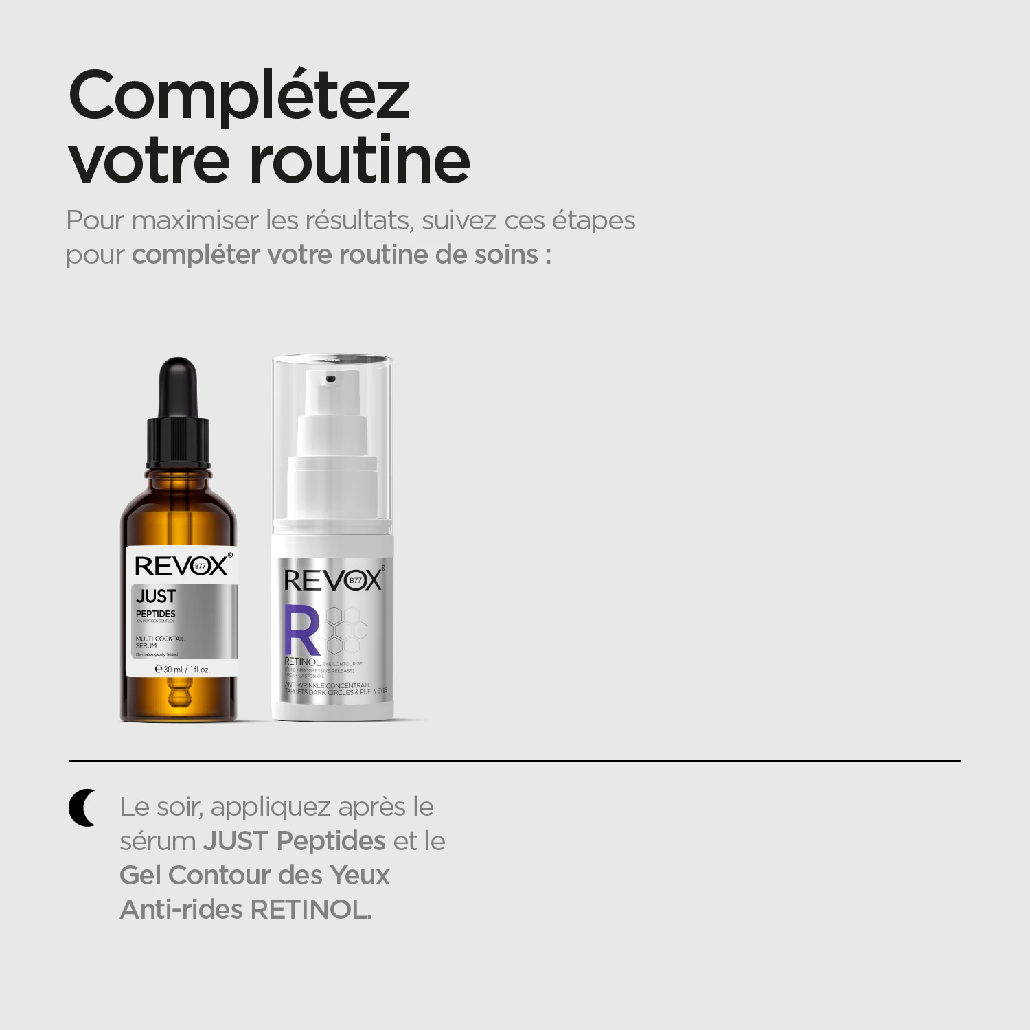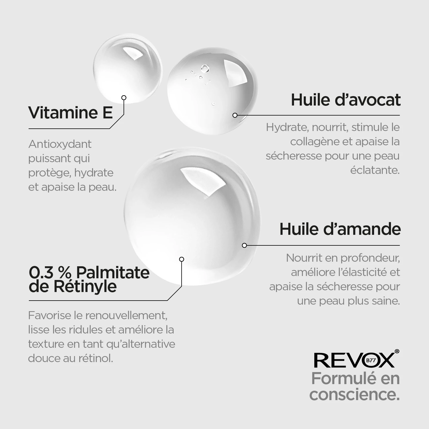 Mode d’emploi : Appliquer généreusement le soir sur la peau nettoyée et parfaitement sèche du visage et du cou en évitant le contour des yeux. Tapotez doucement jusqu’à absorption complète. Utilisez toujours une protection solaire le matin. Pour de meilleurs résultats, combiner avec REVOX B77 RETINOL Protection quotidienne FPS20 et RETINOL gel yeux concentré anti-rides