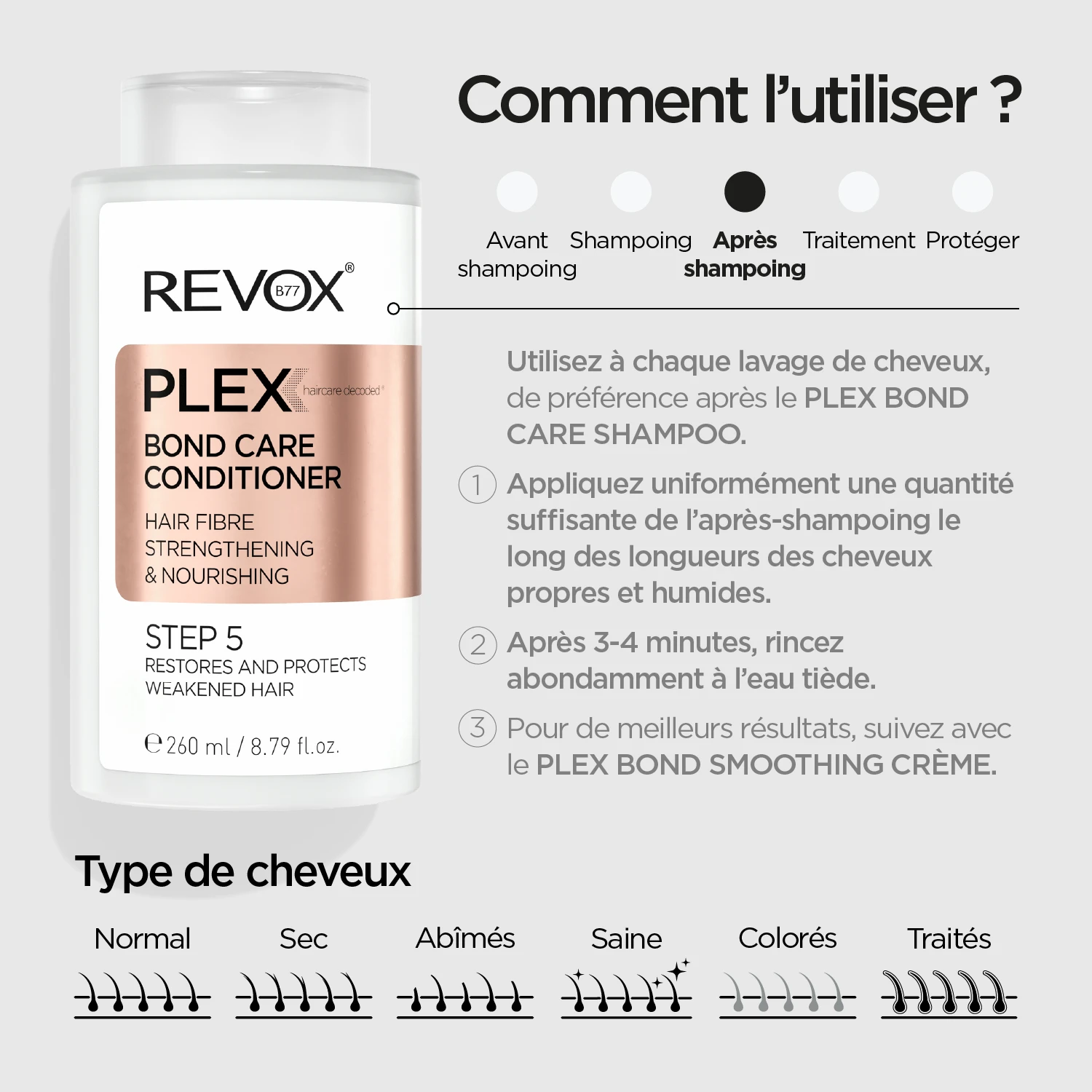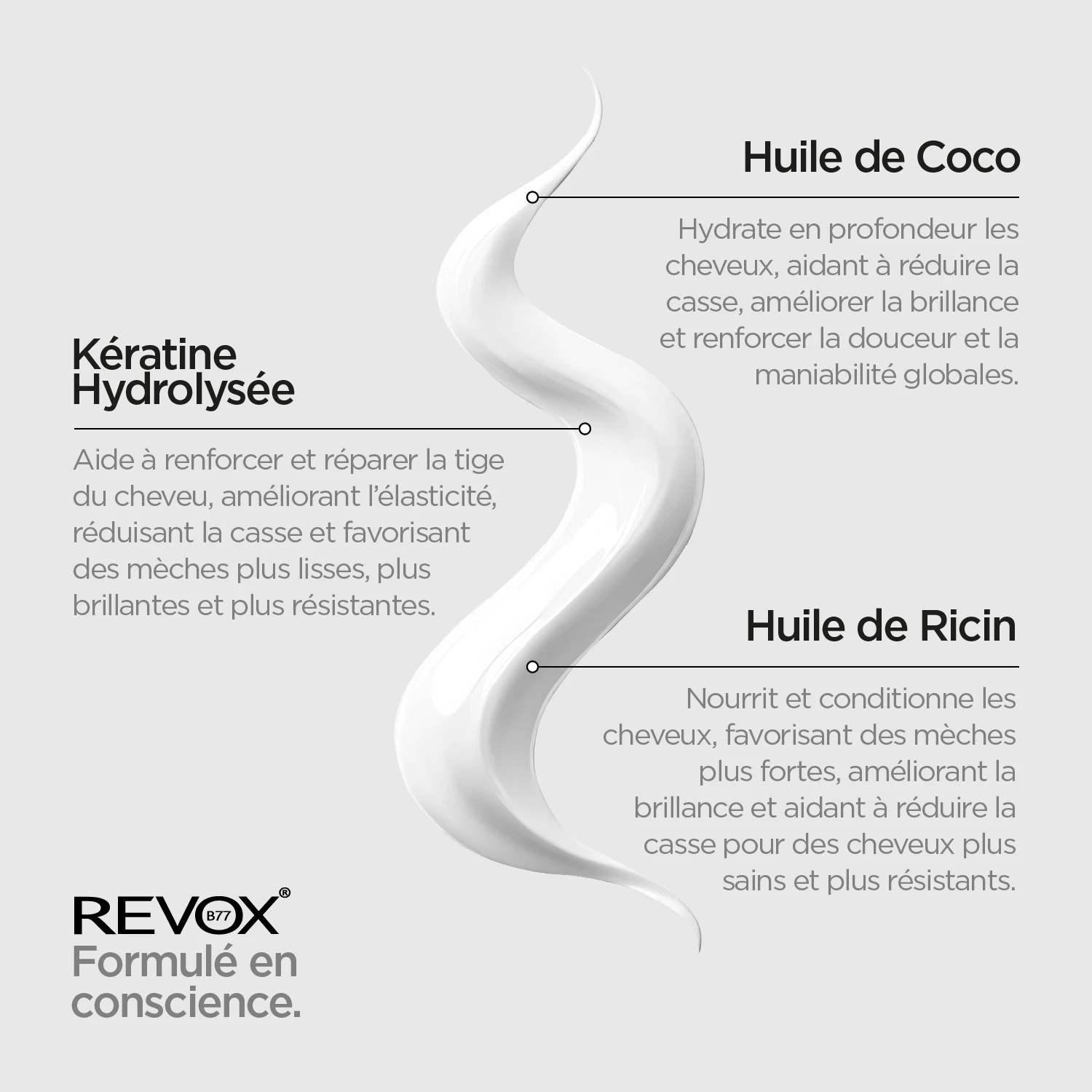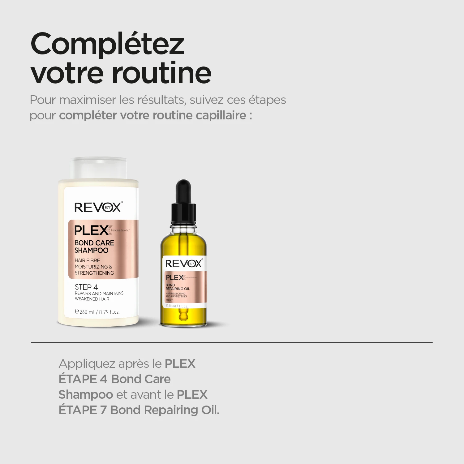 Utiliser chaque fois que vous vous lavez les cheveux, de préférence après le SHAMPOOING REVOX B77 PLEX BOND CARE.