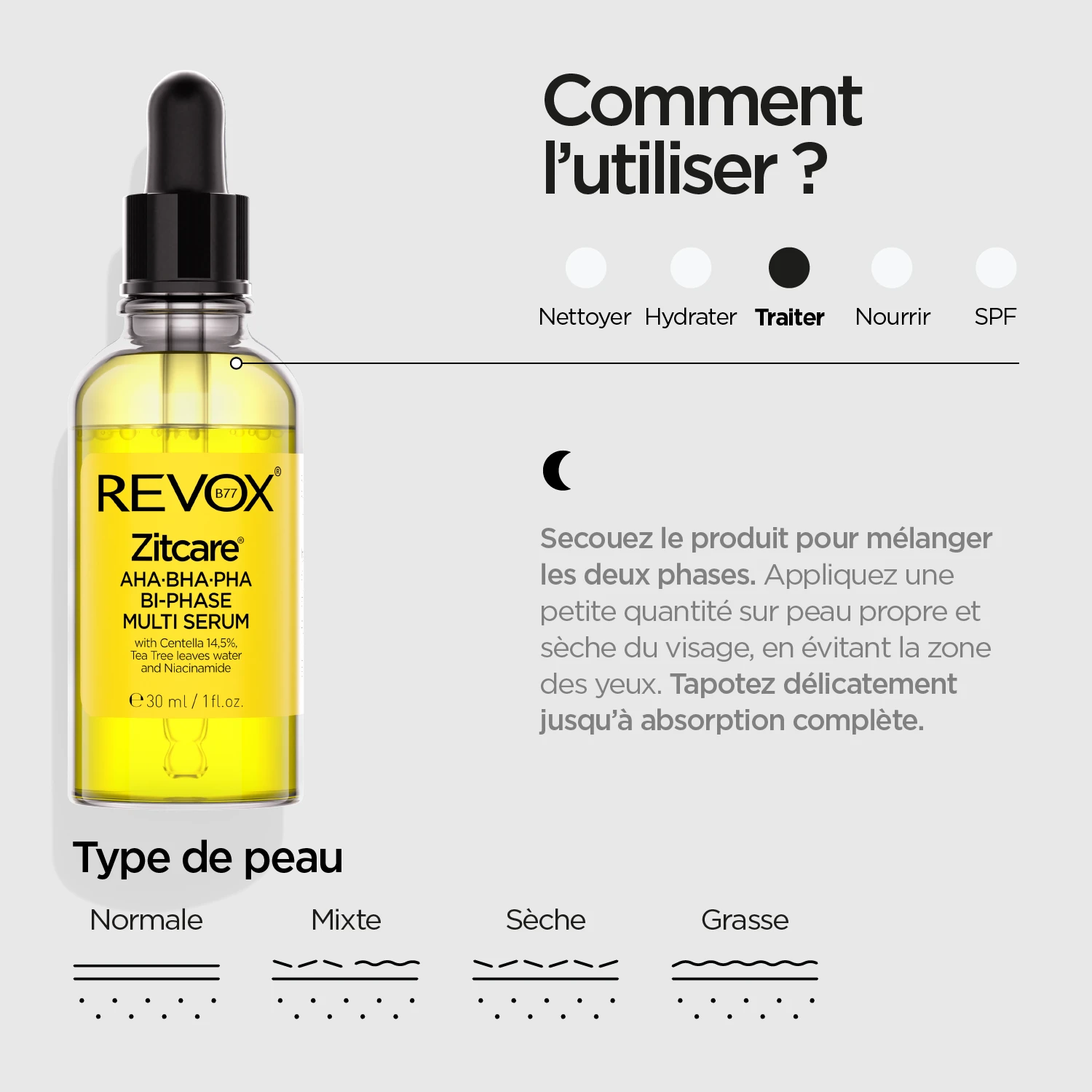 REVOX B77 ZITCARE® AHA.BHA.PHA. BI-PHASE MULTI SERUM Le sébum est une substance huileuse qui lubrifie les cheveux et la peau et qui s’agglomère parfois avec les cellules mortes non éliminées, obstruant ainsi les pores et les follicules pileux. Ce processus crée de l’acné et des boutons sur la peau, l’irrite et la rend problématique. Le traitement de ce problème doit être systématique et persistant, ce qui permettra d’atténuer les boutons et les imperfections existants et de contrôler les futures poussées. La ligne REVOX B77 ZITCARE® combine des ingrédients actifs qui aident à nettoyer, à traiter les imperfections, à réguler la production de sébum et à maintenir une peau saine et lisse. Le sérum multiphase pour le visage contient un mélange d’AHA, de BHA et de PHA qui aide à éliminer les cellules mortes de la peau, à réguler la production de sébum et à donner à la peau un aspect lisse et mat. Associé à l’arbre à thé dans la formule, il possède des propriétés apaisantes et contribue à l’amélioration de l’apparence des pores dilatés. La Centella Asiatica contribue à renforcer la barrière protectrice et à prévenir la perte excessive d’humidité, ce qui permet à la peau de rester hydratée. Le niacinamide joue un rôle dans le lissage de la peau et l’amélioration globale de sa texture.